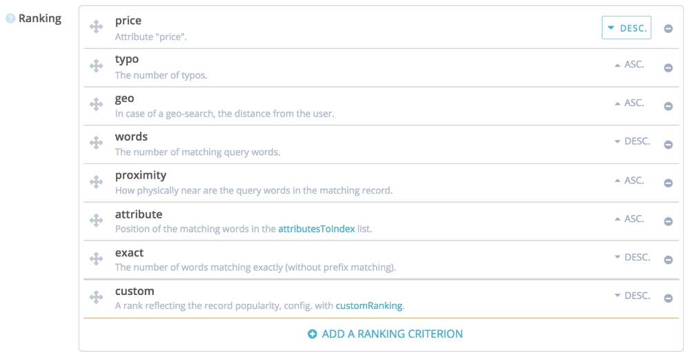 To achieve the best performance possible, we pre-compute your sort criteria at indexing-time. This is an optimization to ensure you will always have outstanding performance at query-time. The consequence of this approach is that you cannot change the sort criteria of an index at query-time: each index has its unique ranking strategy and you need to have one duplicate of your data per sort criteria.To sort your results with a specific attribute (like price or timestamp) you can update the default list of ranking criteria to include your attribute first: