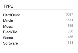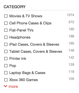 Disjunctive facets allow to filter by one or multiple values of the attribute (e.g. 'Movies & TV Shows' OR 'Printer Ink'). They are most of the time displayed with checkboxes.
